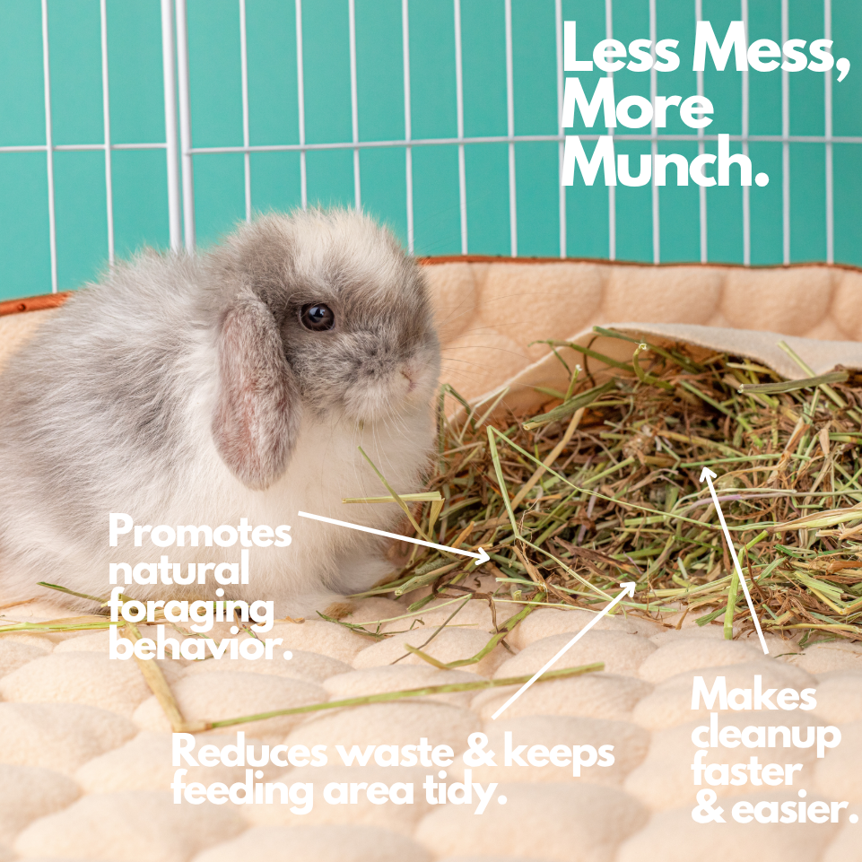 Yes, the Hopp'd HutchLiner™ includes an in-built hay feeding pocket. This feature promotes mess-free feeding, reduces refill frequency, encourages natural foraging behavior, and saves bedding space.